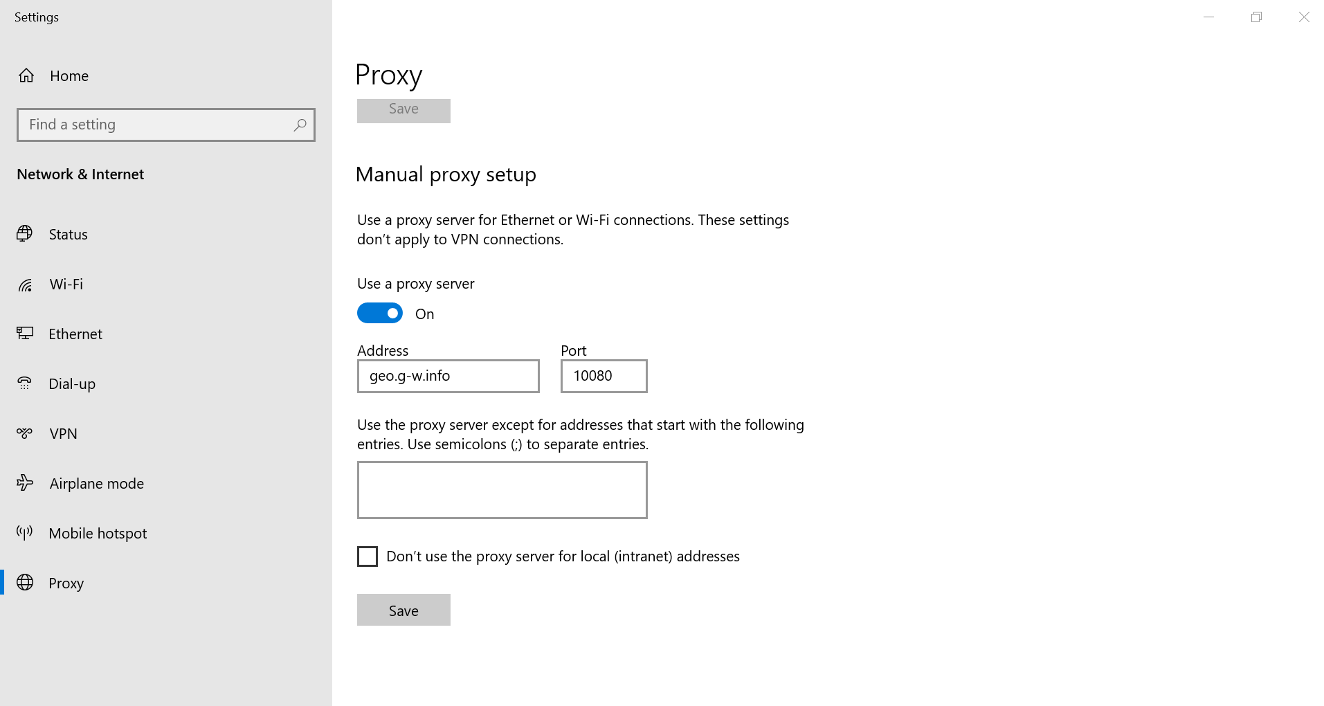 Step 4: The proxy set up window pops-up. The first thing to do is turn the “Use a proxy server” toggle on. Next thing is to paste the proxy details and click “Save” when done.
