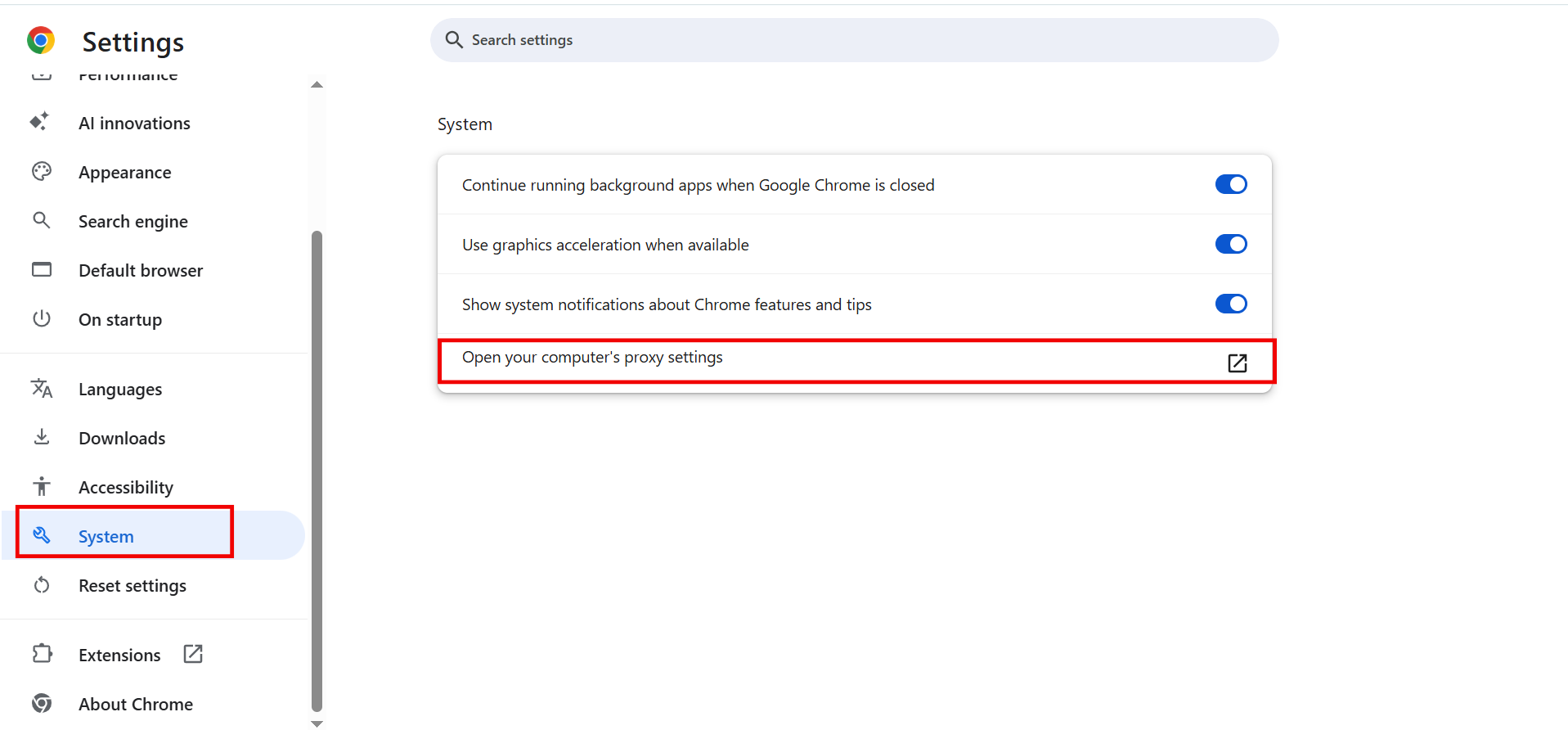 Step 2: On the new window, select “Systems” and click on the “Open your computer’s proxy settings” option.