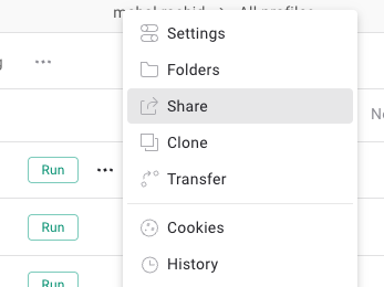 Come back to your Gologin dashboard where you created the profile. Click the three-dot menu of the Midjourney profile and click Share.