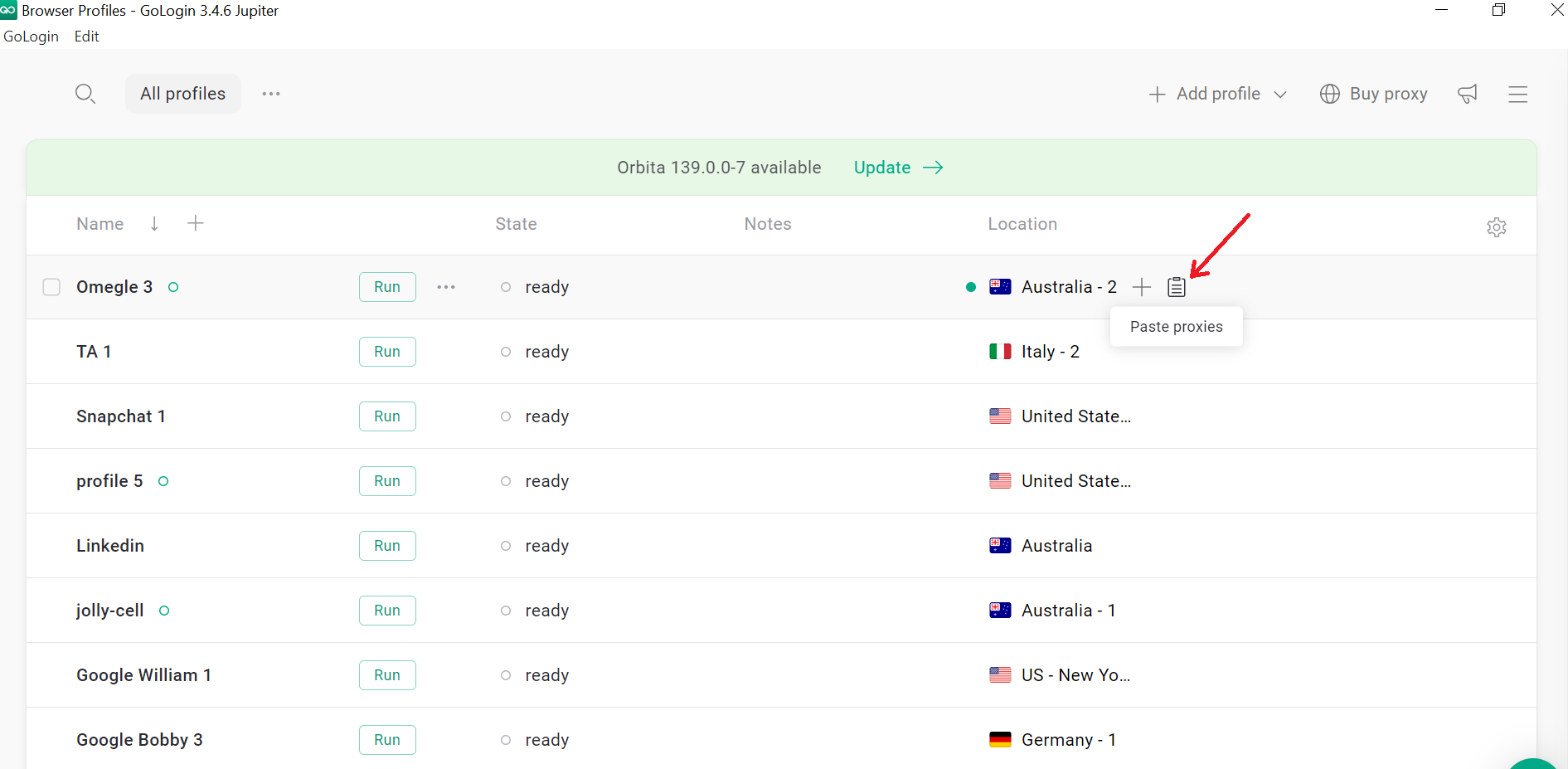Then in the location column click the paste proxies button. There paste the Floppydata proxies you copied from the proxy pool for Omegle.