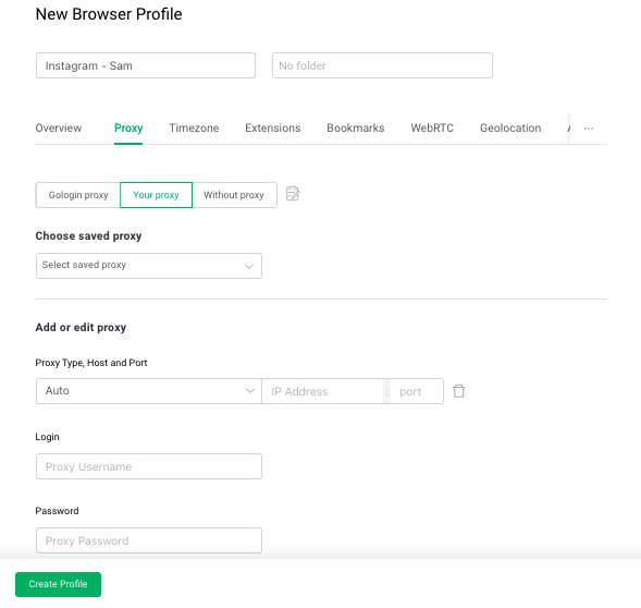 You should name this profile something suitable. For example, if you’re going to use it for an Instagram account of a client named Sam, name it “Instagram – Sam”. This is just an example. You can come up with your own naming convention. Apart from naming, you also get an option to configure a proxy in Gologin.
