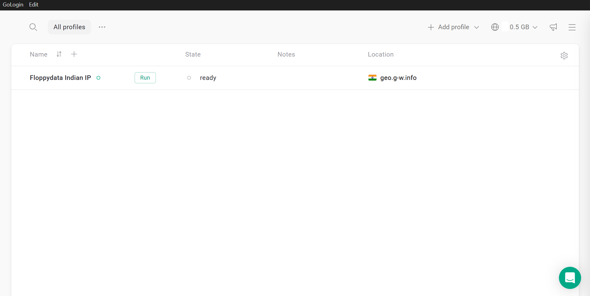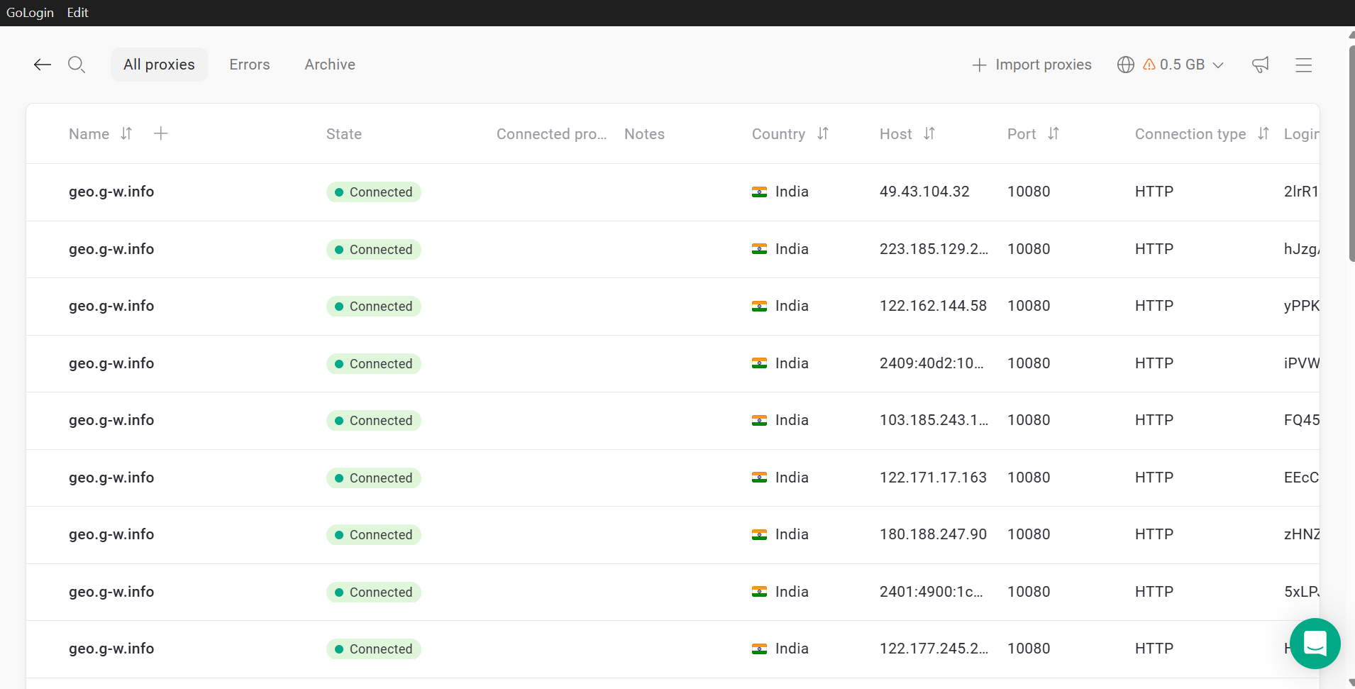 Este es el aspecto que tendrá tu lista de proxies indios en Gologin: