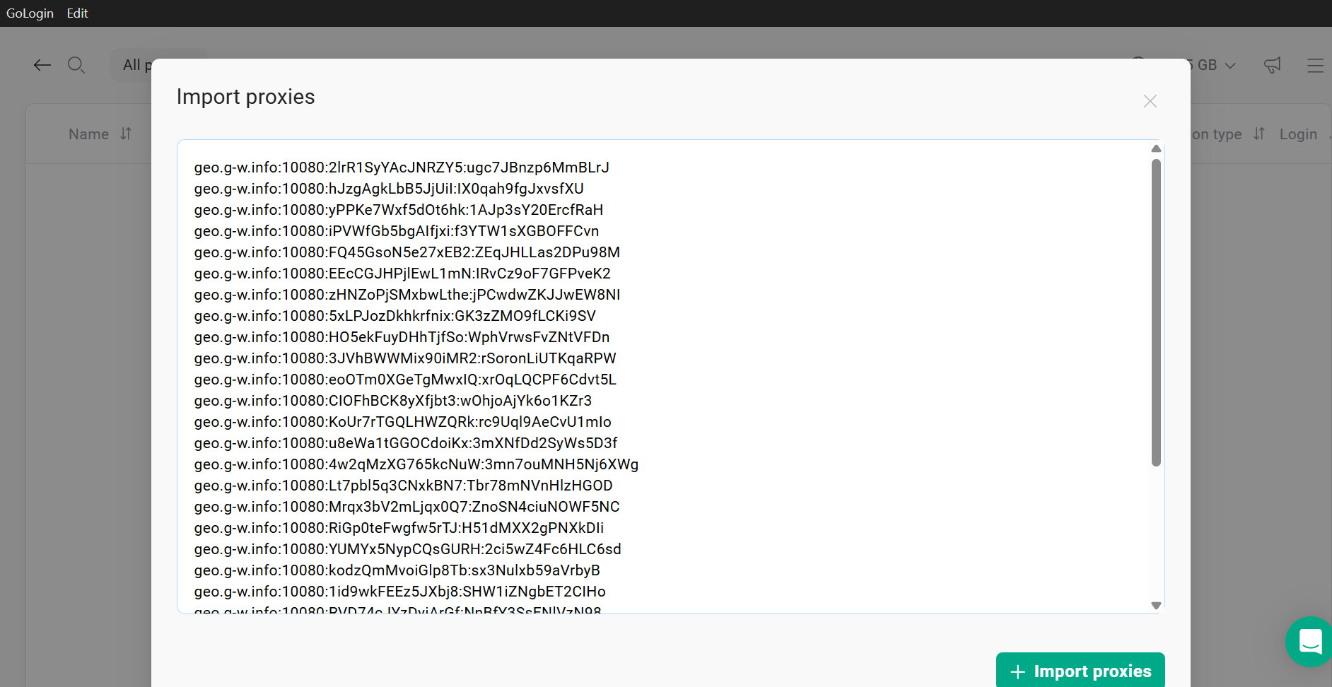 Haz clic en Importar proxies en la esquina superior izquierda y pega allí tu lista de proxies:
