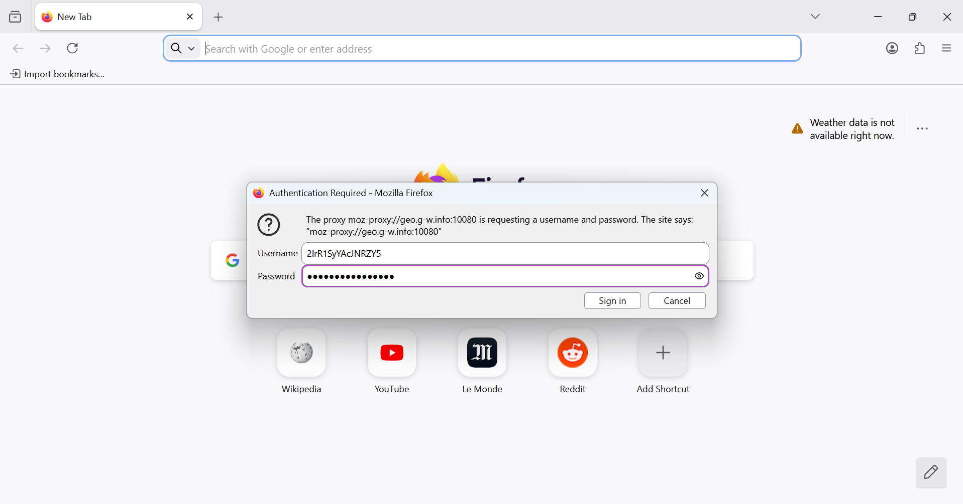 Cuando Firefox se abra de nuevo, se te pedirá que introduzcas un nombre de usuario y una contraseña, que también encontrarás en tu lista de proxy en Floppydata.