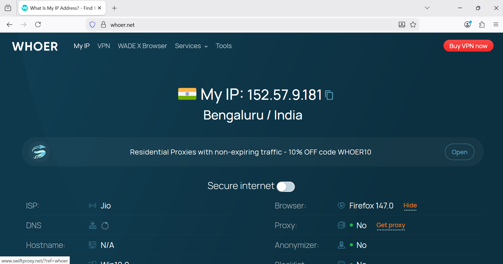 Una vez que hagas clic en iniciar sesión, tu navegador Firefox utilizará correctamente tu dirección IP india seleccionada.