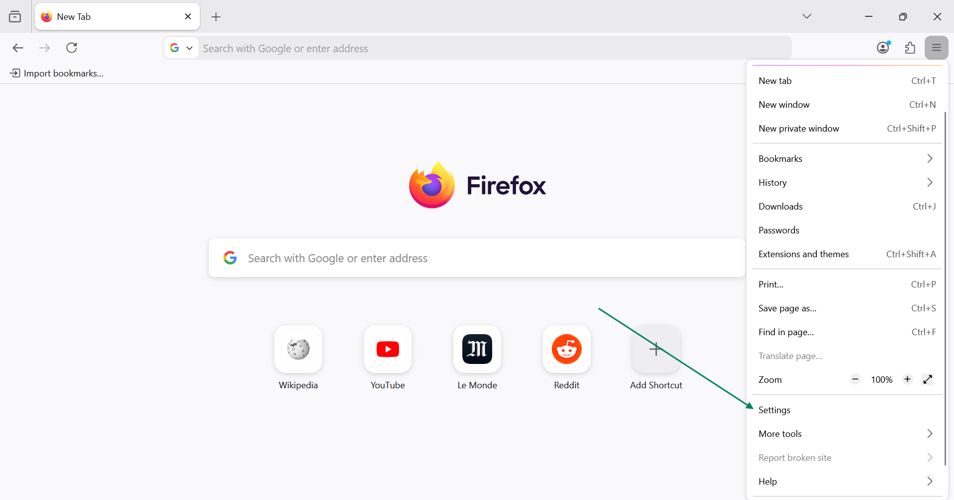 Abre tu navegador Firefox, haz clic en el menú hamburguesa (☰) de la esquina superior derecha y selecciona Configuración.