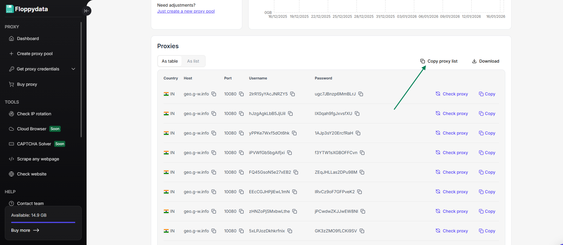 En primer lugar, vuelve a tu lista de proxy de Floppydata y haz clic en «Copiar lista de proxy».