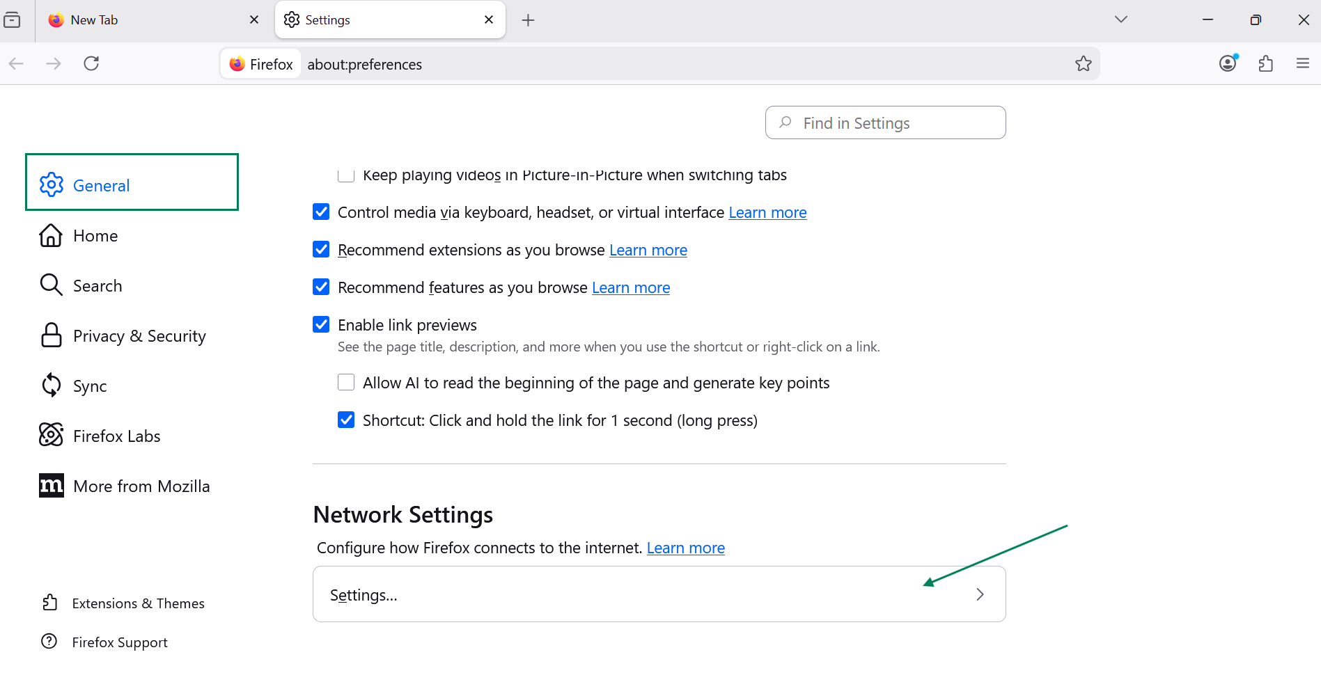 Permanezca en la pestaña General, desplácese hacia abajo hasta encontrar la sección Configuración de red . Haz clic en Configuración…
