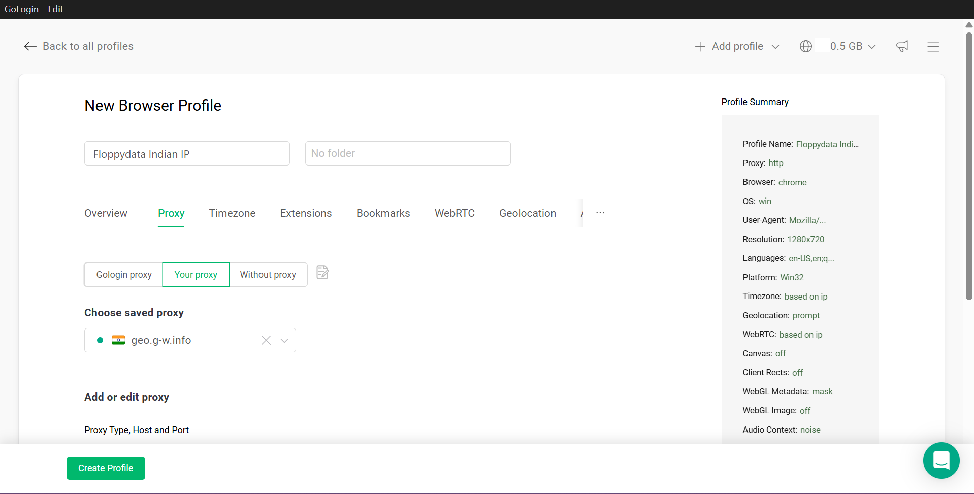 Lo siguiente que harás será crear el perfil del navegador. Ahí es donde utilizarás tu IP india para navegar por Internet de forma anónima.