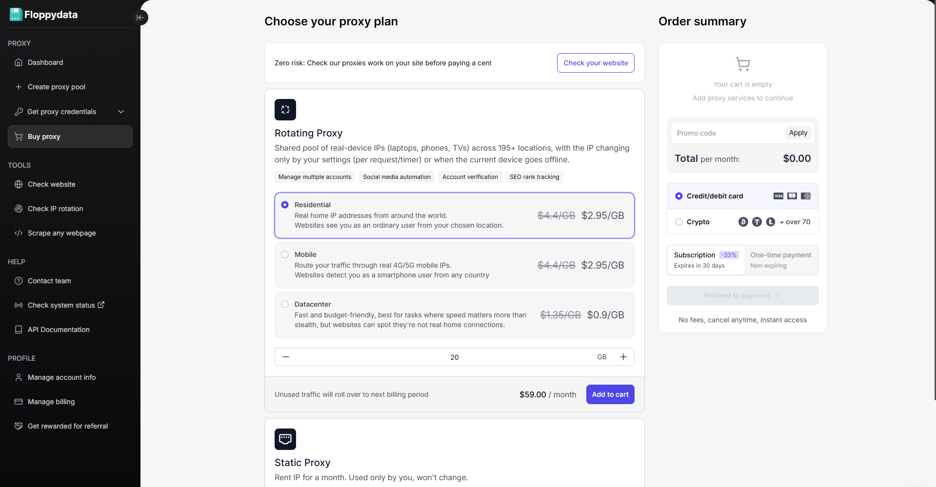 Une fois que vous avez terminé d’expérimenter l’essai gratuit d’un dollar de Floppydata, vous pouvez acheter les proxies les plus abordables et les plus sûrs directement à partir de votre tableau de bord.