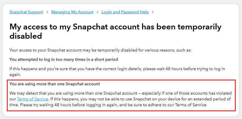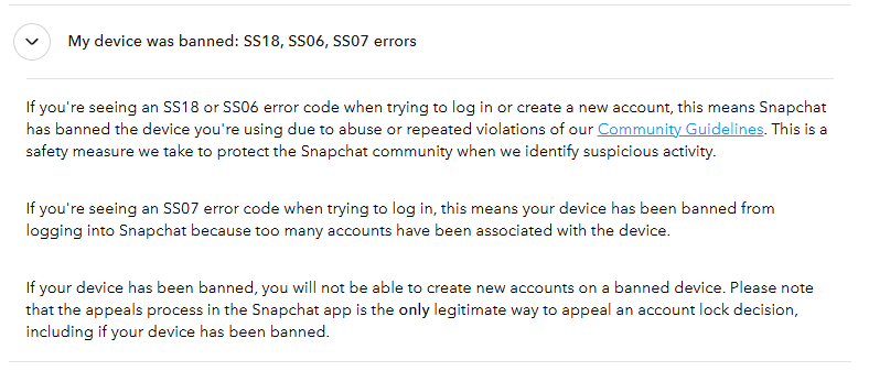 Voici un extrait de l’assistance de Snapchat décrivant les raisons pour lesquelles Snapchat peut interdire votre compte.