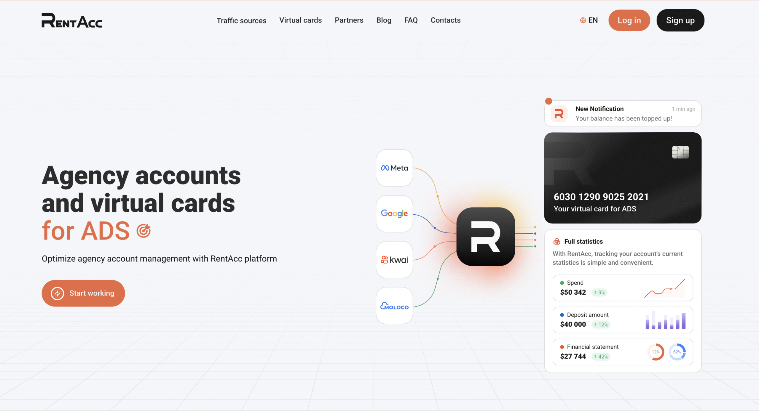 RentAcc is a platform built specifically for media buyers, affiliate teams, and marketing agencies who work with Facebook, Google Ads, Moloco, BIGO, KWAI, Mintegral, Mi Ads, Iron Source, and other traffic sources.